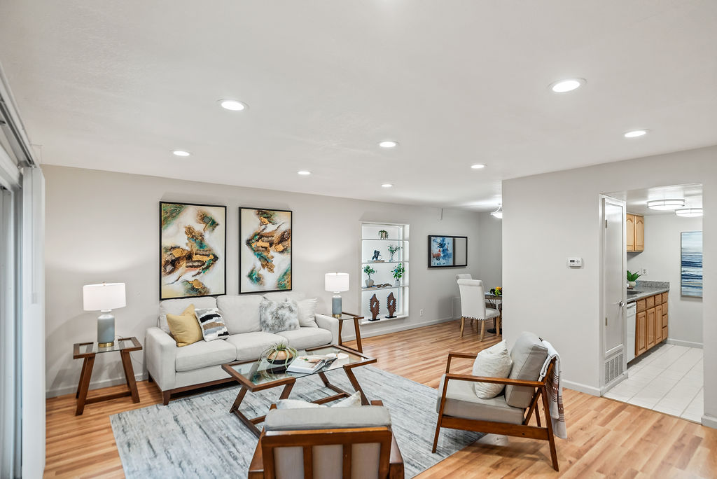 Light-toned flooring, wide windows, and recessed light brighten the open living room. The kitchen features refrigerator, dishwasher, and convenient pass-through to the dining area, making hosting, everyday living, and cleanup a breeze.